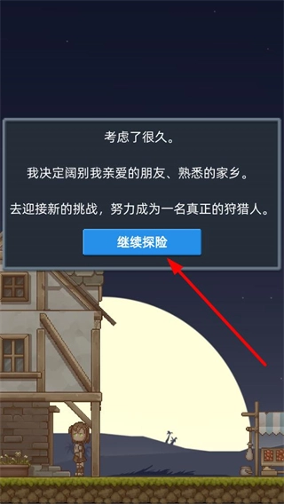 完成角色选择后,界面会弹出剧情提示框,点击“继续探险”按钮即可推进剧情,从而逐步解锁新的场景与情节。