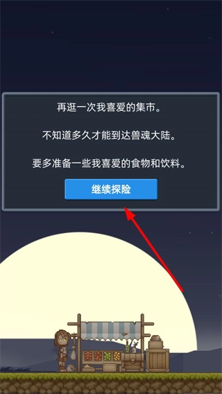 4、不断点击界面里的继续探险按钮,逐步解锁集市、铁匠铺之类的场景剧情,得到食物、武器这类探险需要的物资。