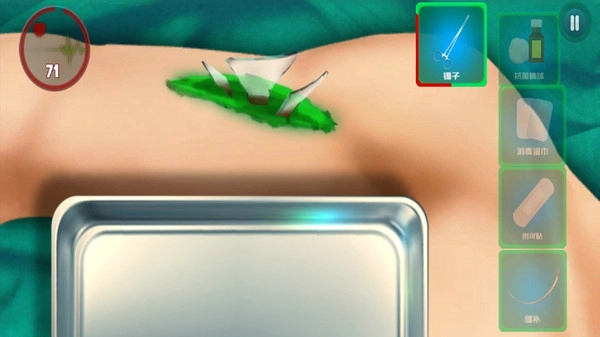1、进入关卡后,首先要查看病人的伤情诊断情况,弄清楚外伤的具体类型和救治方面的需求,同时熟悉需要用到的医疗器械以及操作的先后顺序。