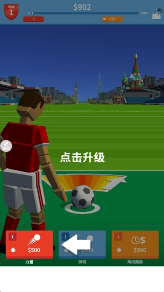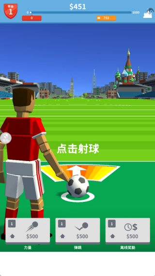 2、足球距离目标越远,玩家能获得的奖励就越丰厚,因此需要调整射门的角度与力度,以此增加足球的移动距离。