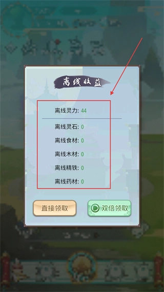 3、领取【离线收益】时,建议优先选择【双倍领取】,这样能获取更多像【离线灵力-44】这类资源,从而加快修炼进度。