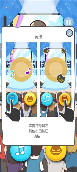 1、游戏的玩法十分简单,当女孩身旁出现声音符号时,点击左边的按钮即可;若出现的是声音符号以外的其他符号,则需要点击右边的按钮。