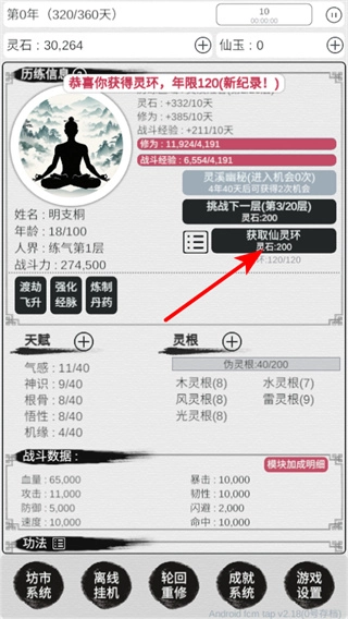 1、在游戏启动界面,点击“开始修仙之旅”即可进入修仙玩法流程,这是开启天道轮回修仙体验的基础操作步骤。