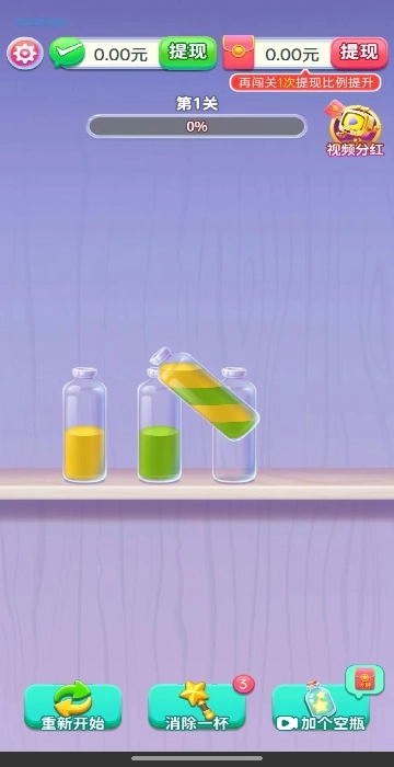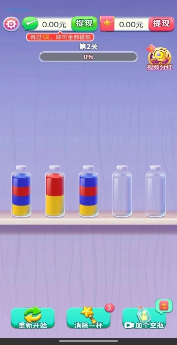 1、操作极为简单直观,只需轻点选中瓶子,再点击目标瓶子就能完成倾倒动作,液体流动时伴有丝滑的动画效果和清脆的音效,体验感很不错。