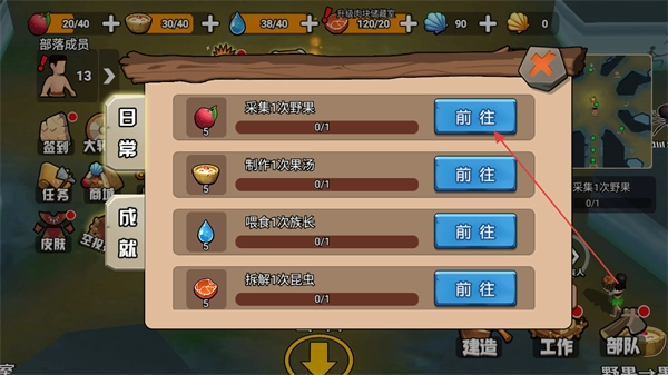 在日常任务界面中,选择“采集1次野果”并点击“前往”按钮,以此推进该任务的进度。
