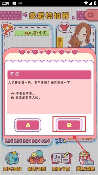 2、开学抽奖时可选择【B】或【A】,不同的选项会对后续剧情产生影响,需要结合个人喜好与期望的剧情走向来做决定。