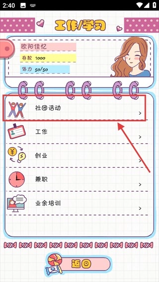 3、在【工作/学习】界面找到并点击【社团活动】,通过参与社团活动来拓展社交圈或提升个人能力,从而助力习惯养成。