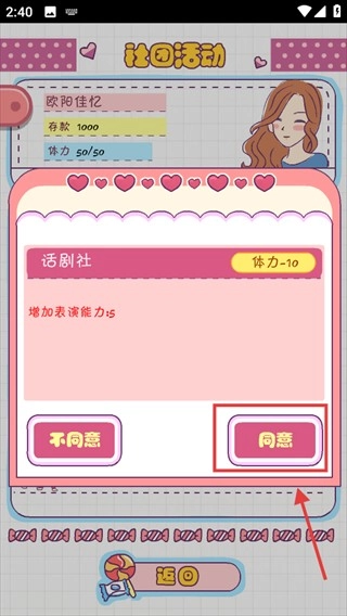 4、参与话剧社活动时点击【同意】,将消耗10点体力并提升5点表演能力,以此助力个人技能的发展。
