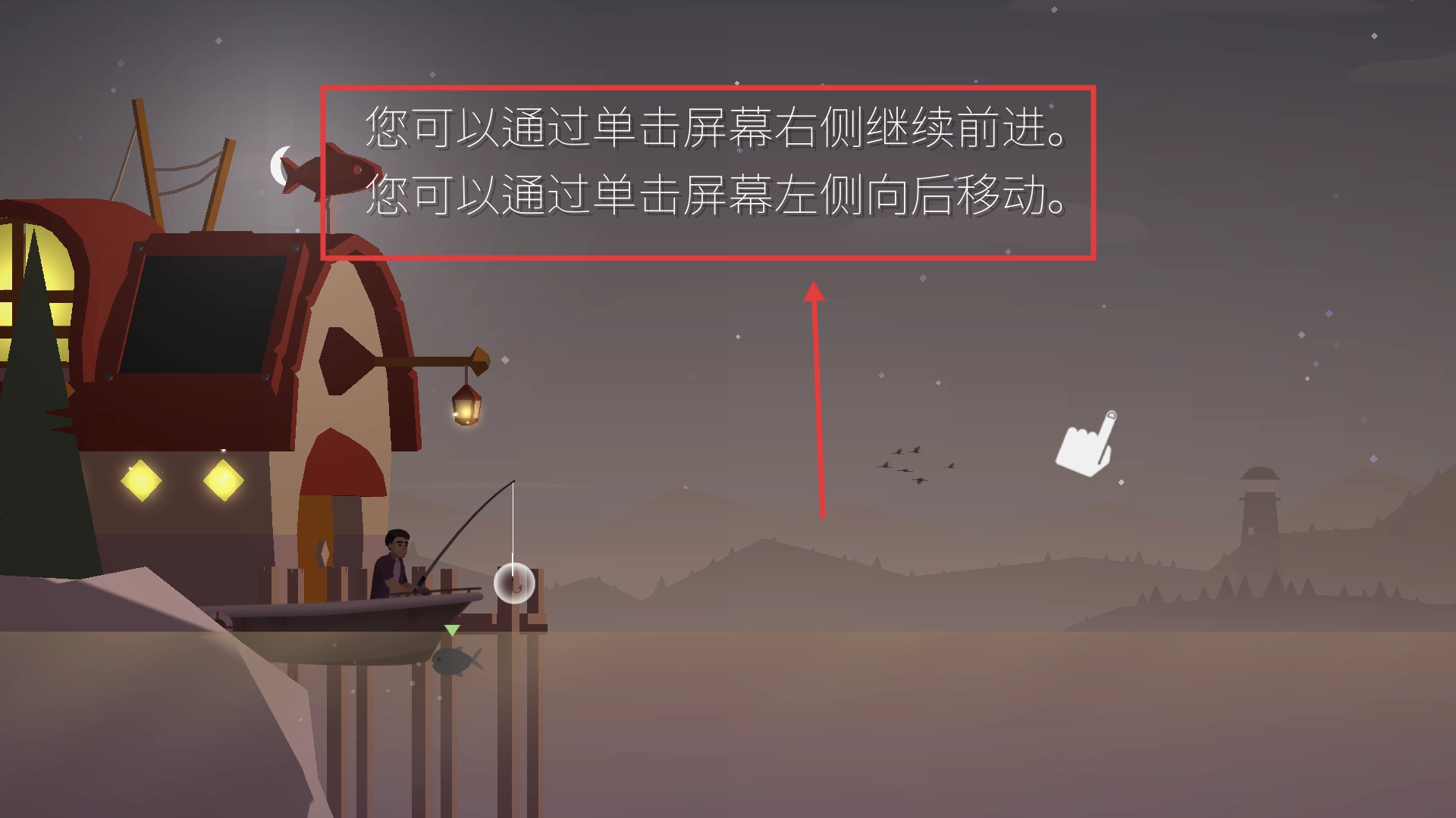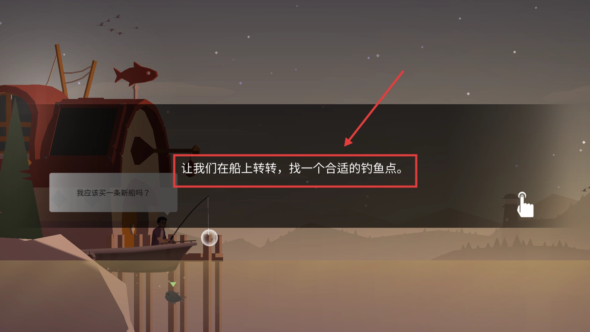 2、点击屏幕右侧可操控船只前进,点击左侧可操控船只后退,通过灵活调整船只位置,寻找更优的垂钓区域,从而提升钓鱼收获。