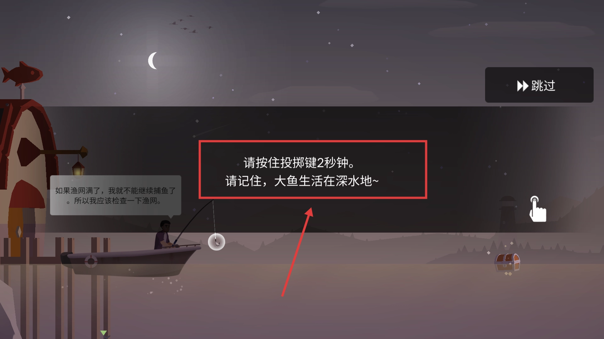3、按住【投掷键】2秒钟,让鱼钩深入水中。要知道大鱼大多生活在深水区域,在这种地方更容易钓到珍稀鱼类,从而丰富你的收藏。