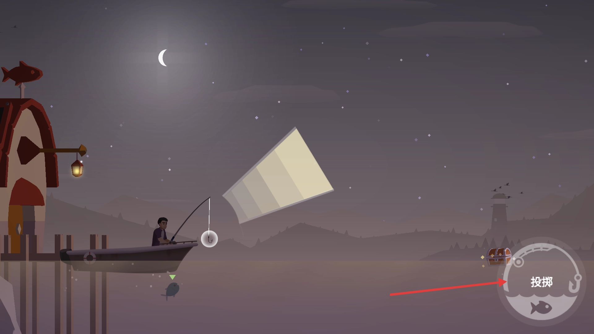 4、点击【投掷】按钮抛出鱼钩,尽量投向远处的水域,以此扩大垂钓范围,增加钓到不同鱼类的几率,收获更多乐趣。