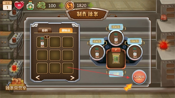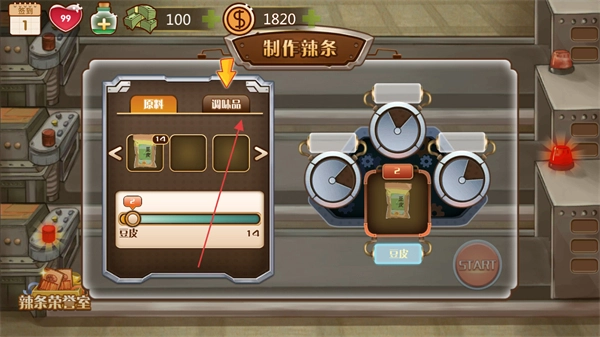 1、进入辣条制作界面后,挑选豆皮、调味品等食材,将它们添加至对应的槽位中。