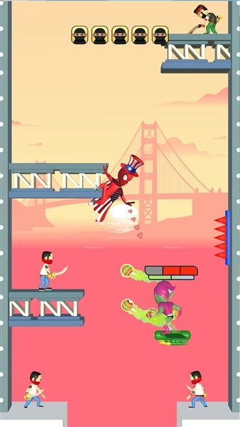 2、操控蜘蛛侠把控好方向,一步步闯关消灭敌人,继续推进以消灭更多敌人。