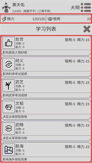 4、优先选择学习处世之道,仅需消耗少量银两与精力,即可提升处世能力,进而影响其他人物对自己的好感度。