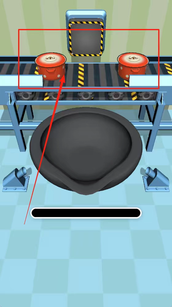 1、留意传送带输送的红色圆形盒子,重点关注被红线所指的带把手容器,清晰确定初始操作对象与核心目标。