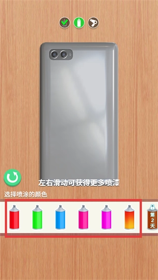 3、在颜色栏里左右滑动,就能切换更多喷漆颜色;选中心仪的颜色(比如蓝色)后,就可以对手机壳进行喷涂了。