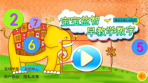 进入界面后,找到标注着【宝宝益智早教学数字】且注明【建议年龄2-8岁】的区域,点击被红色框选的播放按钮,就能启动数字教学关卡。
