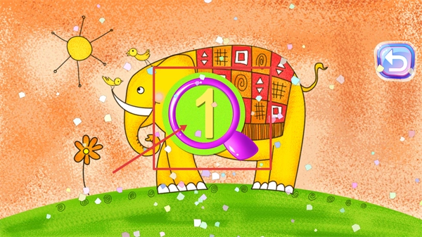 3、把紫色放大镜挪到【数字1】的位置,通过触发特效来完成对这个数字的识别,这是数字认知环节里至关重要的操作步骤。