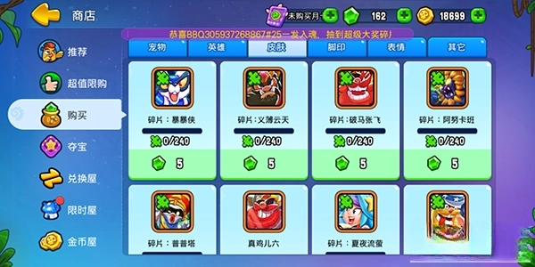 英雄皮肤能够改变英雄的外观和技能特效,所有皮肤都得积累够对应的同名皮肤碎片才可以兑换。皮肤碎片可以在商店里购买,每个碎片卖五钻石,而且一直都不会下架。