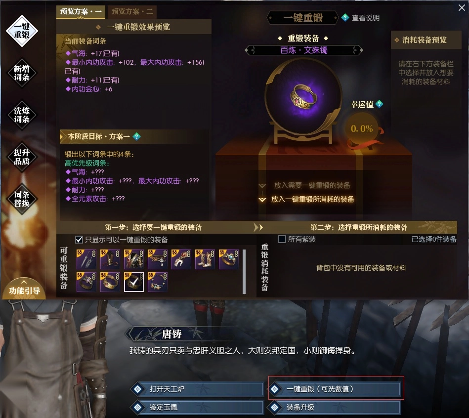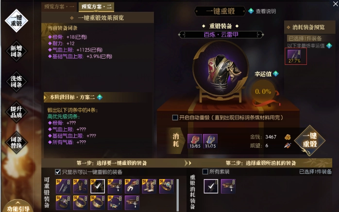 “一键重铸”功能界面上有“预览方案一”和“预览方案二”两个选项。操作时,先选定要锻造的装备,再选择目标方案并放入“狗粮”装备,此时会显示该“狗粮”能增加的幸运值。需要注意的是,并非要等幸运值达到100%才会出现新词条——即使幸运值只有10%,也可能提前触发方案中的词条;直到装备的四个词条全部替换为所选方案中的词条,这次重铸才算成功。