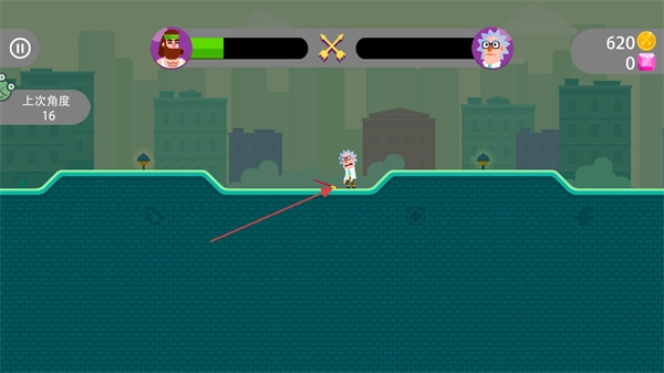 拉动角色,将力度调整到97%、角度调至16度,瞄准目标后射出箭矢。