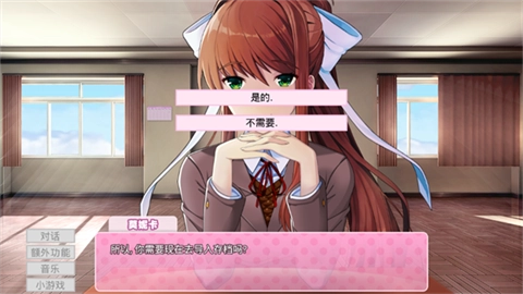 在这款游戏里,玩家能够与一位名为莫妮卡的角色进行交流互动,针对不同的对话选项做出抉择,而这些不同的选择将会带来各异的结果。