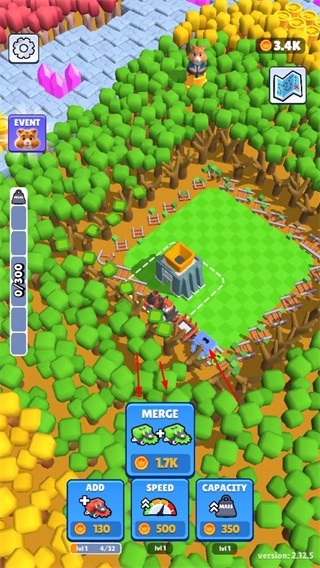 点击MERGE合并伐木车,提升伐木效率,这是积累资源的关键操作,开启伐木经营之旅。