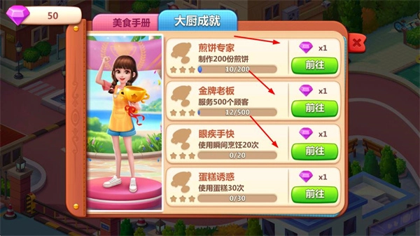 这里设置了煎饼专家、金牌老板、眼疾手快、蛋糕诱等多种成就任务,完成这些成就就能获得钻石之类的奖励。