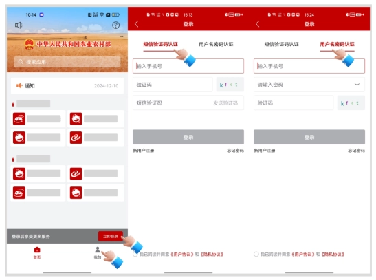 第二步:根据您的需求,您可选择【手机短信验证码】或【用户名密码】这两种方式进行登录。