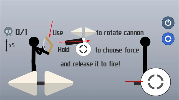进入射击关卡后,按照提示操作:用左右箭头按钮转动武器,按住力量选择按钮来调节射击力度。