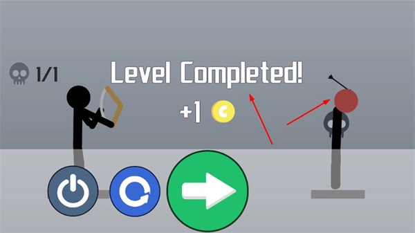 成功击倒目标后,关卡即宣告完成,此时会获得金币奖励;之后点击绿色箭头按钮,就能进入下一关继续挑战。
