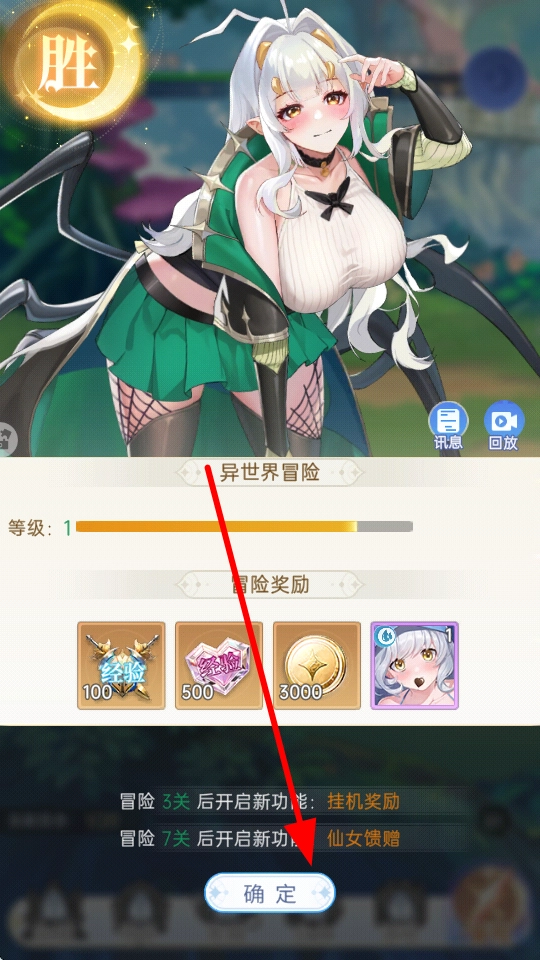 战斗获胜后,会出现胜利结算界面,这时点击确认,就能领取冒险奖励,其中包含经验、道具等,可以帮助角色成长。