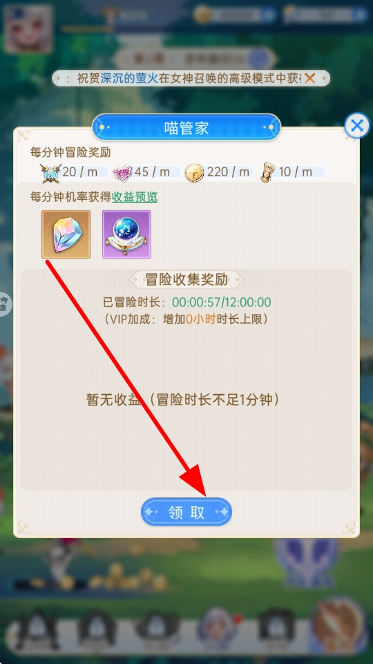 在喵管家界面可以查看冒险时长以及对应的物品奖励,当达到领取要求时,点击领取按钮,就能获得相应的冒险奖励收益。