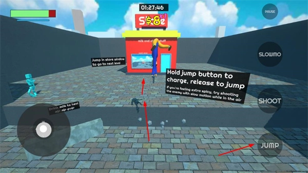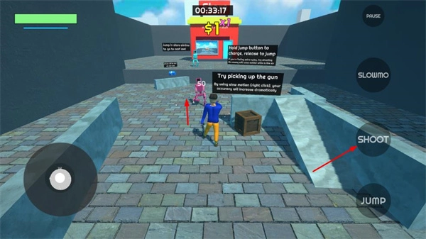 在这个场景里,你可以和其他角色进行互动,也能收集枪械之类的物品,借助右侧的SHOOT按钮来开枪,通过JUMP按钮完成跳跃动作。