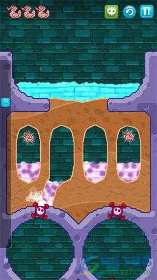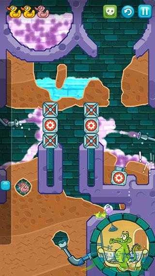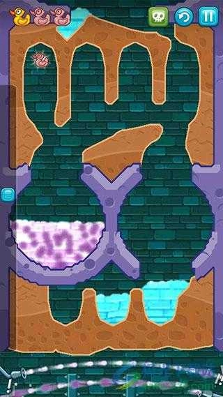 最终就会呈现出下图所示的模样,把清水引导下来就能收集到最后一只鸭子,最后将水引到鳄鱼所在之处,任务便完成了。
