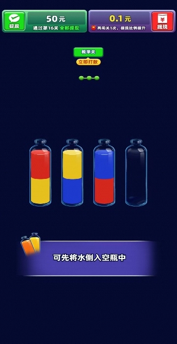 玩家需通过来回倾倒水瓶中的水,把分散的水柱汇集到一个瓶子里,就能完成关卡并获得奖励。