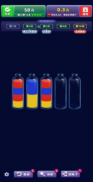不同颜色的水不能倒进同一个瓶子里,只有颜色相同的水才可以倒入同一层,这让游戏的策略性和挑战性都有所提升。