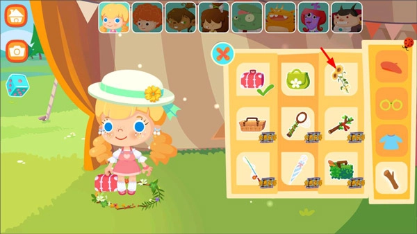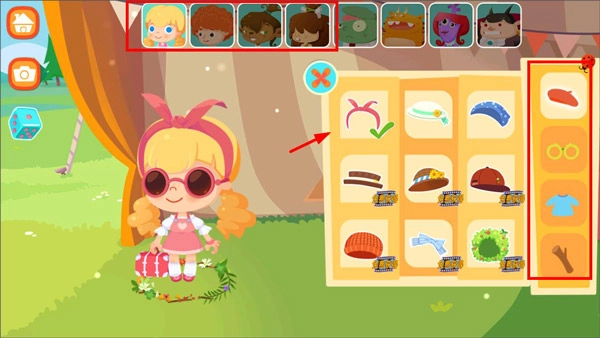 进入换装玩法页面后,就能为糖糖和他的哥哥姐姐进行换装操作了。第一步先从选择头饰开始,点击右侧的换装列表即可。