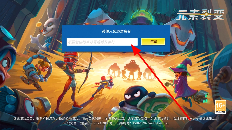 首先启动游戏,在角色名称输入界面,输入你喜欢的角色名,注意不要包含标点符号或特殊字符,输入完毕后点击完成按钮,就能开启在元素裂变世界的冒险之旅了。