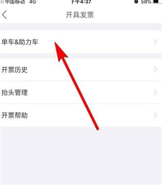 4、进入开具发票的页面后,找到箭头指示的“单车助力车”选项,点击该选项进入。