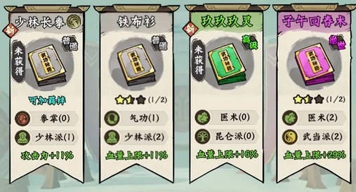 搭配思路:前10关能学习少林长拳、铁布衫、太清掌法和太清罡气。20关前建议优先解锁新武功,以凑齐核心羁绊效果。25关前学会乾坤大挪移(可免疫怪物首次攻击),接着点出几个2星的紫橙色招式,借助峨眉羁绊的加成,输出会直接拉满,之后再把所有羁绊效果补充完整。