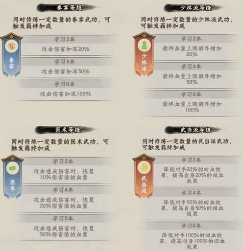 搭配思路:前期主要依靠少林派提升血量上限与昆仑派按比例回血的羁绊效果来稳固自身生存状态,同时借助拳掌武学的攻击伤害加深特性实现输出。进入中期拿到蓝色神通“神龙素女功”后,需优先将其升至3星,此时流派便达到成熟阶段;这套阵容的核心制胜点在于,少林与内功属性叠加带来的高额血量上限,搭配“3星内功”触发的“已习得同门派武功星级+1”的增益效果。