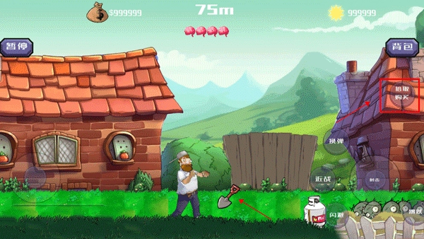 当僵尸逼近戴夫时,戴夫就会被啃食脑子,从图里能看到戴夫目前的生命值是4个脑子,每遭受一次攻击就会消耗一个脑子。游戏前期的僵尸实力相对较弱,如果没有足够的太阳和金币去购买装备,那就拼命点击“近战”按钮来抵御;到了后期有了资源,记得优先购买装备提升战力!