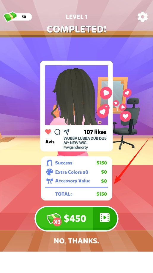 完成发型设计后,会弹出成果展示界面,在这里可以看到顾客分享的新发型,以及获得的点赞数和奖金。如果想获取更多收益,点击绿色按钮观看广告就能让奖金翻倍;要是不想看广告,点击“NO, THANKS”即可收下150美元,然后开启下一关的挑战。