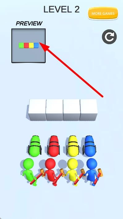 按照颜色的对应关系,让手持锤子的彩色小人去操作颜色匹配的长条形物体,推动白色方块,最终使组合的彩色排列与预览图完全一致。