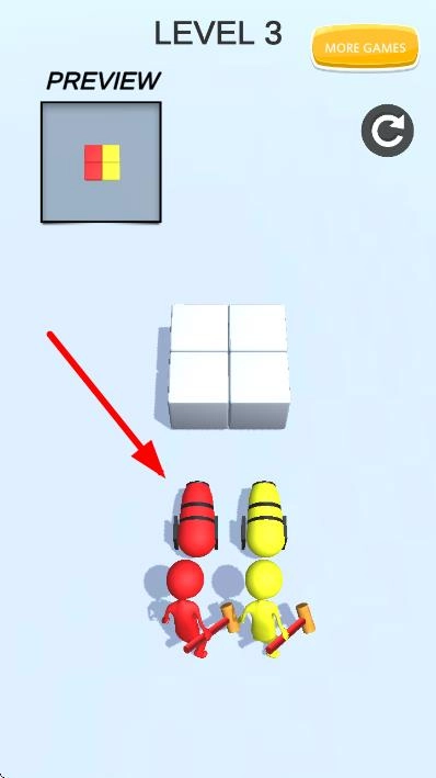 让手持锤子的红黄两色小人,按照箭头的指示方向,操控对应颜色的长条形物体,推动白色方块,使方块最终的组合形态与预览图中的红黄布局完全一致。