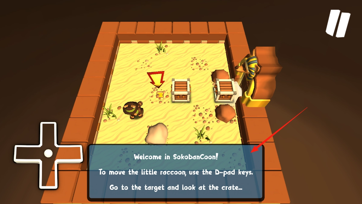 进入SokobanCoon场景后,按照提示用方向键操控小浣熊移动,通过方向键的操作让小浣熊到达目标位置,同时要留意木箱的位置,为之后推动木箱提前做好准备。