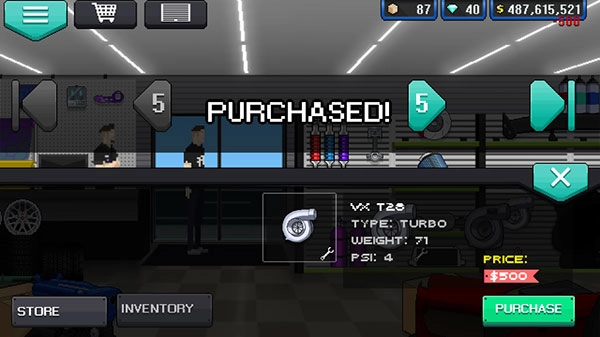 在像素赛车手最新版本里,首先是整体层面的改动,如今进入车库或者商店这类场景时,都会出现一个类似翻页的过渡动画;其次是游戏的帧数得到了提升,运行起来比以往更加流畅。