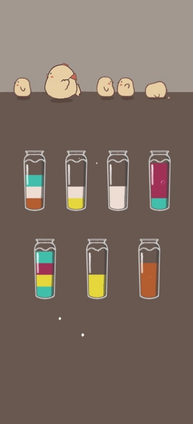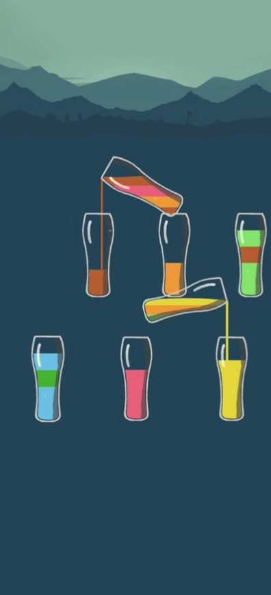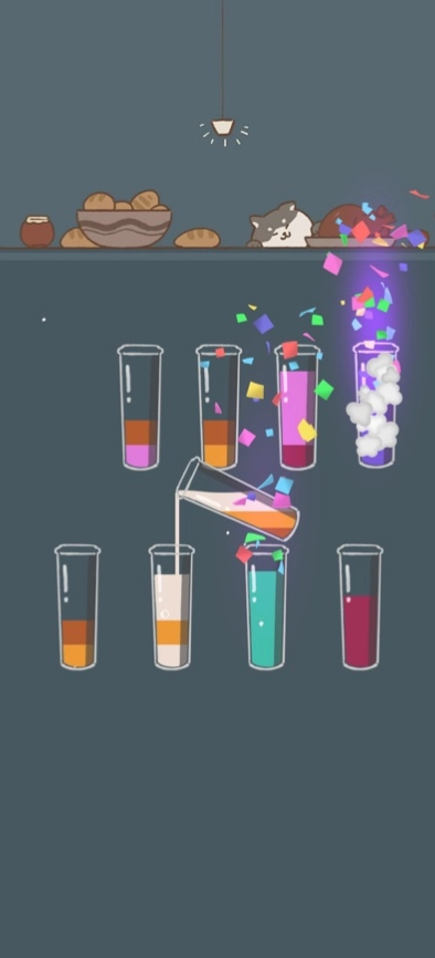 玩家仅需点击玻璃瓶,把顶部的液体倒进另一个瓶子。目标是把相同颜色的液体归置到同一个瓶子里,直至所有颜色都完成分类。