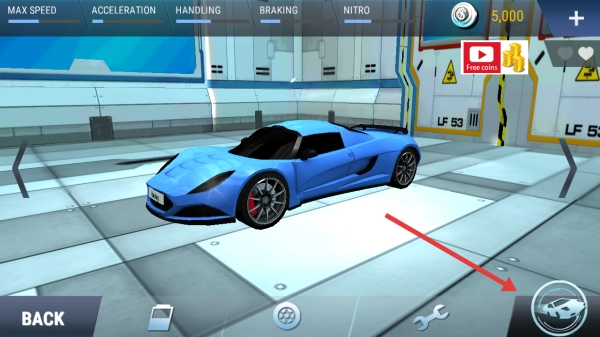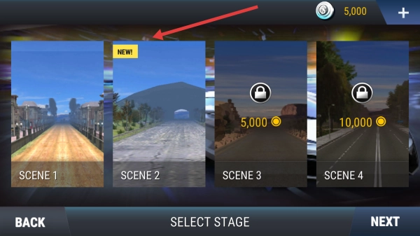 在车辆改装界面,点击右下角的车辆图标进入场景选择页面,然后选择带有NEW!标识的SCENE2。
